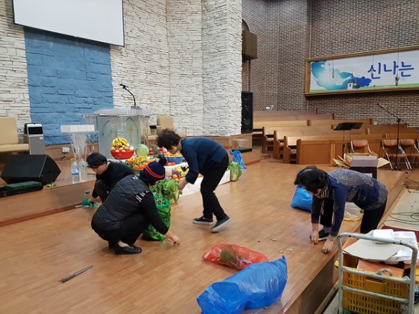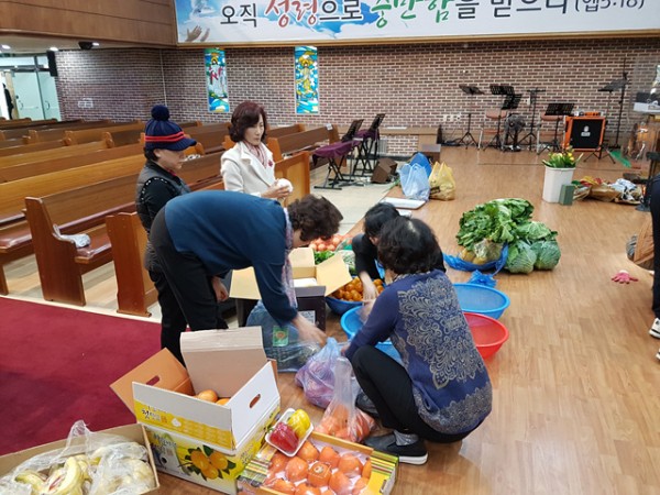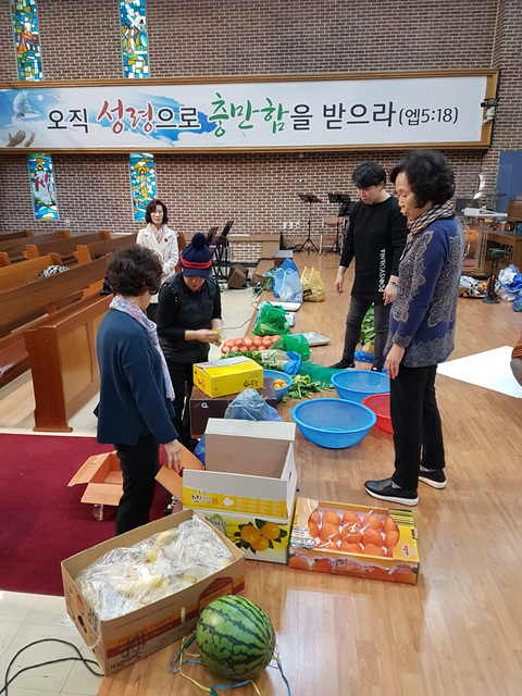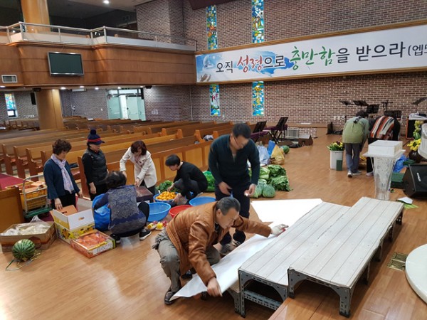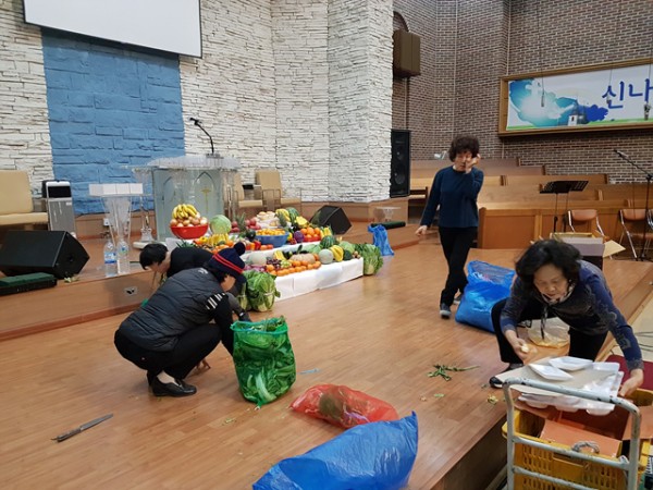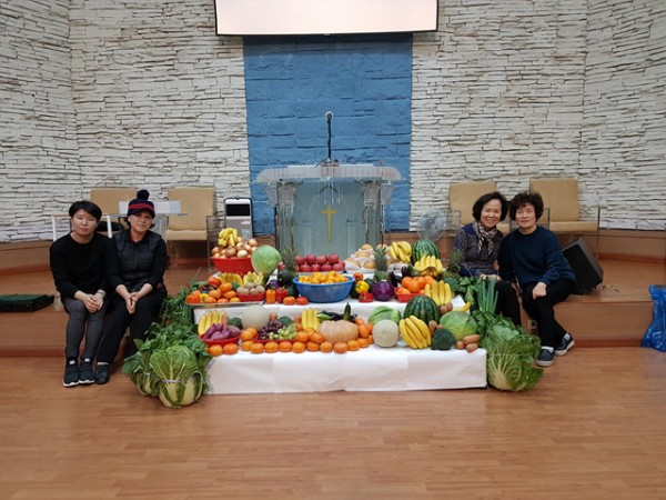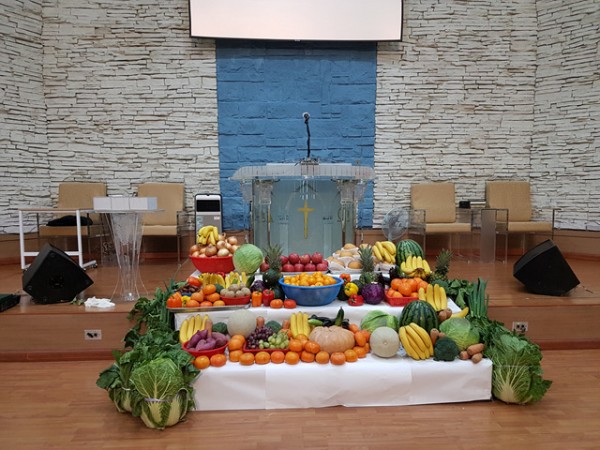 추수감사주일을 맞이하여 각종 과일과 채소로 장식하는